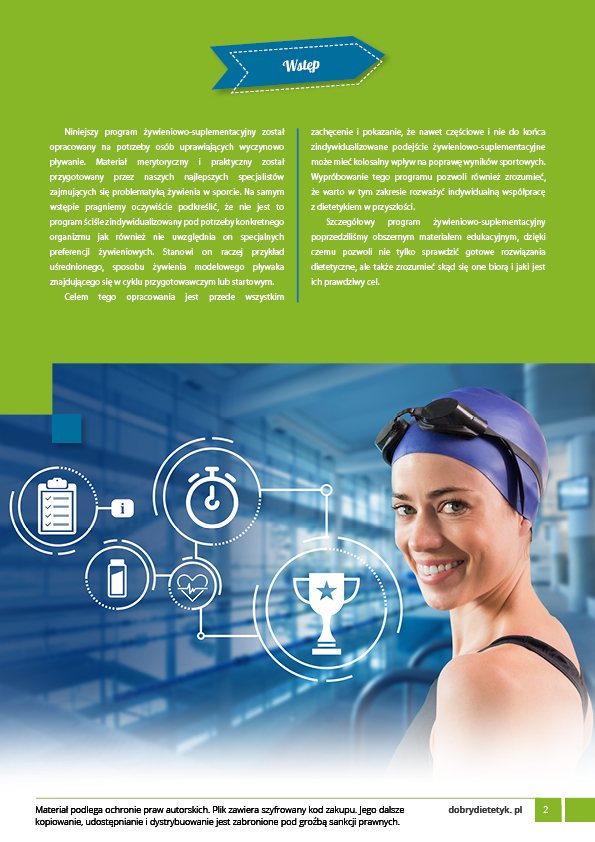 Kompleksowy program żywieniowy dla osób trenujących pływanie zawodowo lub amatorsko. Jadłospis na 30 dni został skomponowany z myślą o pływakach, tak, by wspomóc osiągnięcia sportowe i regenerację organizmu. Pierwsze posiłki w ciągu dnia doskonale sprawdzą się jako posiłek przedtreningowy (koktajle, kasze z owocami, owsianki i omlety), kolejne dania to łatwe do zabrania na wynos potrawy (kanapki, placuszki, naleśniki, jogurty). Dodatkowo jeden z 6 posiłków to naturalny, domowy izotonik przeznaczony do spożycia w trakcie treningu. Kolejność posiłków można zmieniać dowolnie tak, by dopasować w razie potrzeby do rozkładu jednostek treningowych w ciągu dnia.