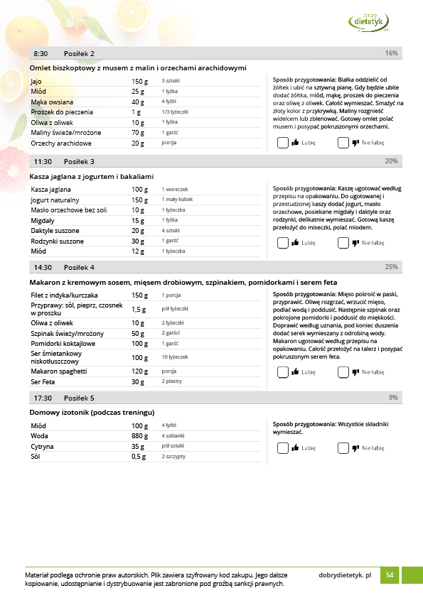 w formie propozycji posiłków (zamiast pojedynczych jadłospisów jednodniowych, przygotowano propozycje kilku propozycji dań na każdy posiłek). Tutaj nie uzależniamy Cię od tego jakie masz np. w danym dniu zjeść śniadanie czy obiad, tylko sam wybierasz sobie ulubione danie z kilku przedstawionych przez nas propozycji.