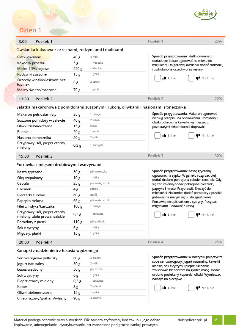 w formie propozycji posiłków (zamiast pojedynczych jadłospisów jednodniowych, przygotowano propozycje kilku propozycji dań na każdy posiłek). Tutaj nie uzależniamy Cię od tego jakie masz np. w danym dniu zjeść śniadanie czy obiad, tylko sam wybierasz sobie ulubione danie z kilku przedstawionych przez nas propozycji.