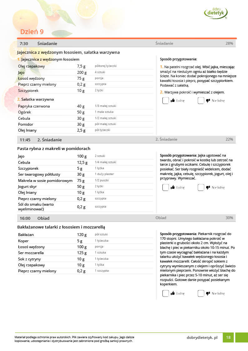 w formie propozycji posiłków (zamiast pojedynczych jadłospisów jednodniowych, przygotowano propozycje kilku propozycji dań na każdy posiłek). Tutaj nie uzależniamy Cię od tego jakie masz np. w danym dniu zjeść śniadanie czy obiad, tylko sam wybierasz sobie ulubione danie z kilku przedstawionych przez nas propozycji.